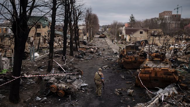 A photo shows destruction in the area of conflict at the Bucha town after it was liberated from Russian army in Ukraine on April 4 2022. YouTube bans Russian parliament channel. What we know on day 44 of the invasion.